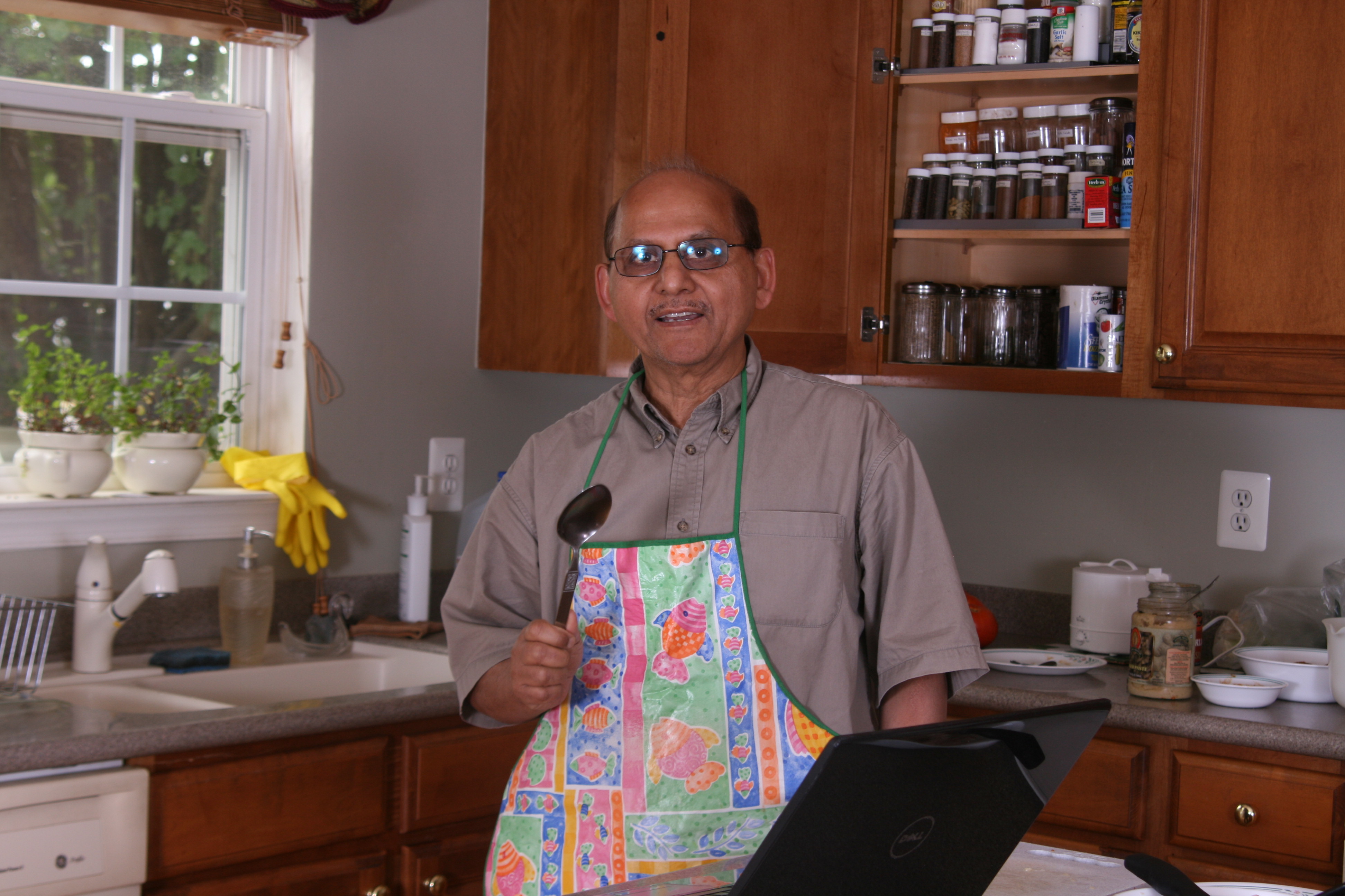 This website is designed to be simple but sophiticated at the same time for the novice cook like me. This website is divided into several sections to make it easy for the visitor to find his/her favorite dish to cook. The methods used are strictly step by step for the absolute novice. I have tried to make this website as fool proof as possible. There are some remarks and notes that might look too simple or childish. I did this on purpose because I believe it is better to be safe rather to be sorry. Masud's Desi Kitchen contains recipes for dishes that I like to cook and enjoy eating them. It does not contain all the Desi dishes, rather only those dishes that I have succeeded in cooking and my guests have enjoyed eating them. Below you can see me working in my kitchen. These are of course self portraits.